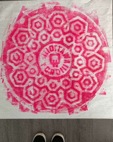 36x36 inches rubbing of street light maintenance cover corner of Rideau and Wurtemburg streets. Done in 2023, using water based acrylics